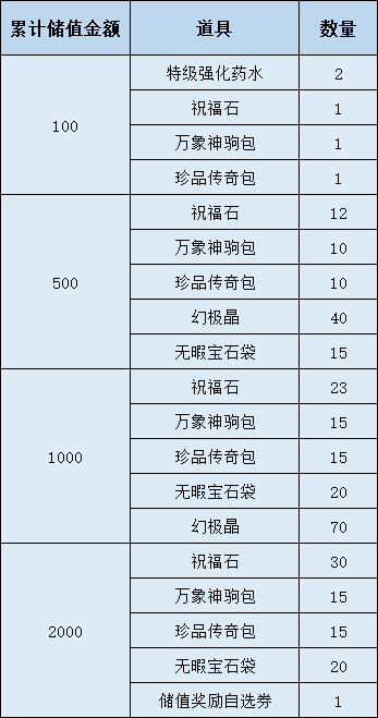 1. 在活动指定时间内储值达活动指定金额即可获赠对应虚拟宝物。