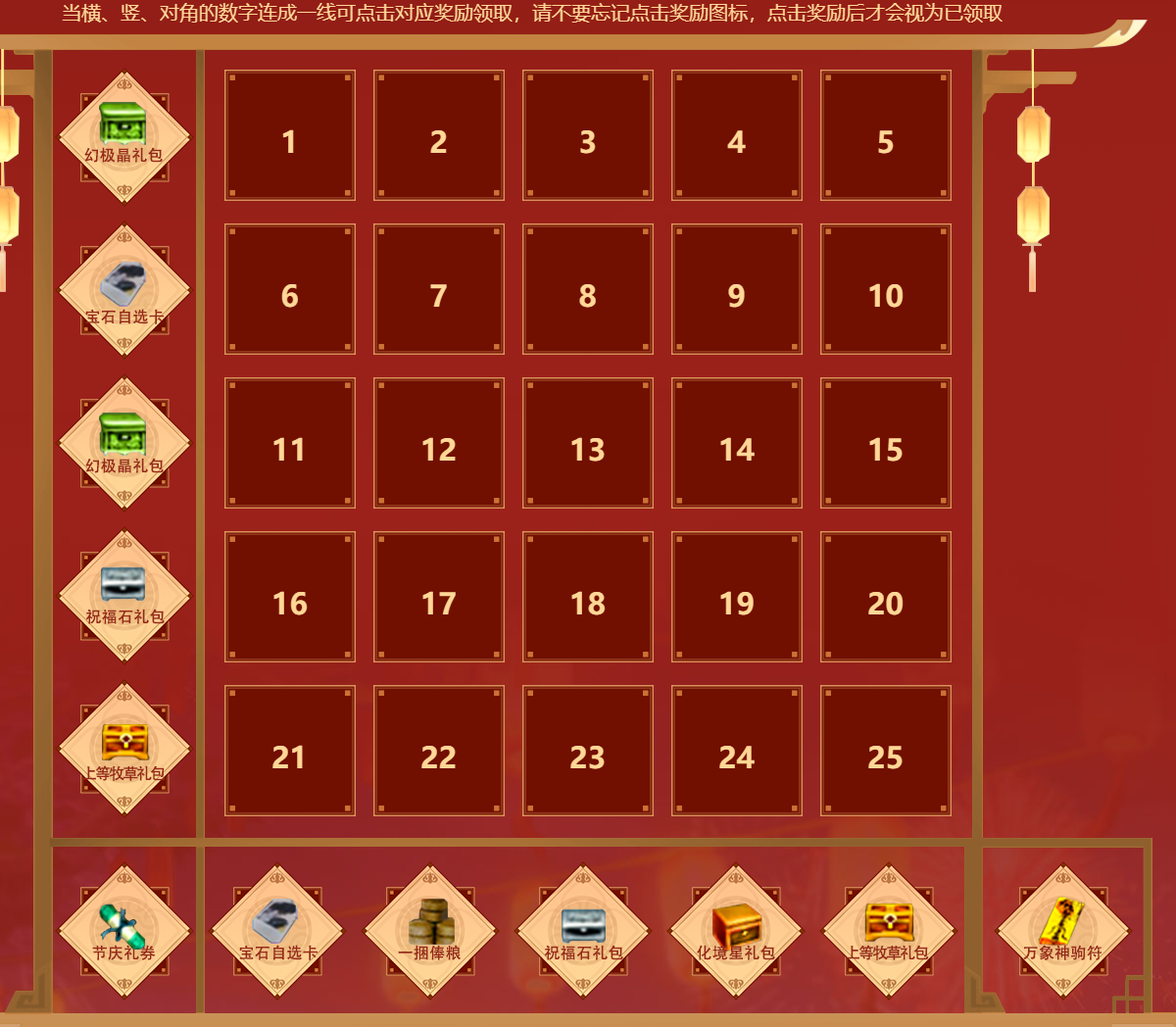 (当点亮的数字连成横、竖、对角时将解锁对应奖励)