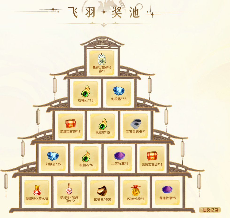 3.参与储值奖池的玩家判定条件为储值价值200元的储值金额,可以获得1次鎏金奖池抽奖次数;参与消费奖池的玩家需要在游戏内商城消费价值2000元宝,即可获得1次飞羽奖池抽奖次数,每个游戏账号选择对应奖池后,对应抽奖次数上限15次,即可获得对应奖池全部奖励。