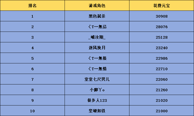 以下为截止9月25日11:00维护前的消费排行,目前公布的排行信息主要为方便玩家参照当前消费状况并不影响最终月消费排行的奖励发放