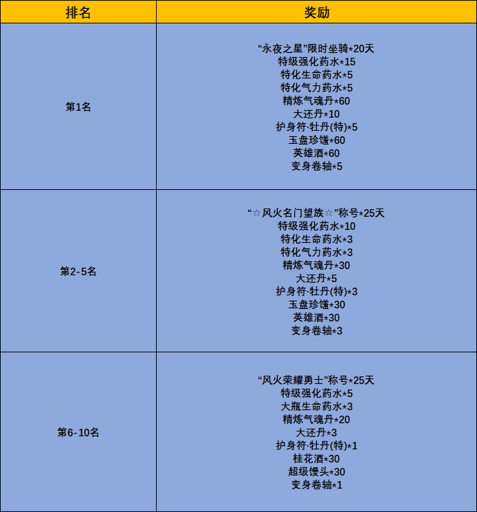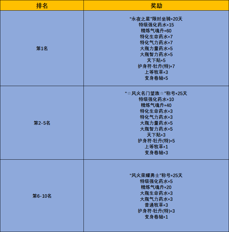 3.排行结果将在次月的第一周内在官网公示,排行奖励也将在次月的第一周内以邮件形式直接发放到排行榜中对应的角色账号中,请确保消费的账号为自己当前使用的账号,避免影响奖励的发放
