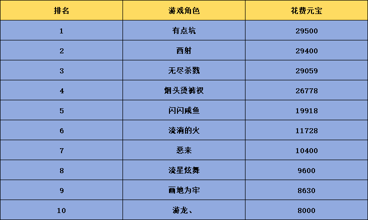 4.消费排行榜中只统计账号内单个游戏账号的消费情况,若使用多个游戏账号进行消费则消费的元宝数量无法进行叠加
