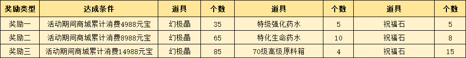 活动内容:活动期间,通过商城花费指定数量的元宝,活动结束后可获得对应的超值奖励。