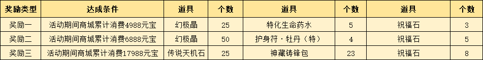 活动内容:活动期间,通过商城花费指定数量的元宝,活动结束后可获得对应的超值奖励。