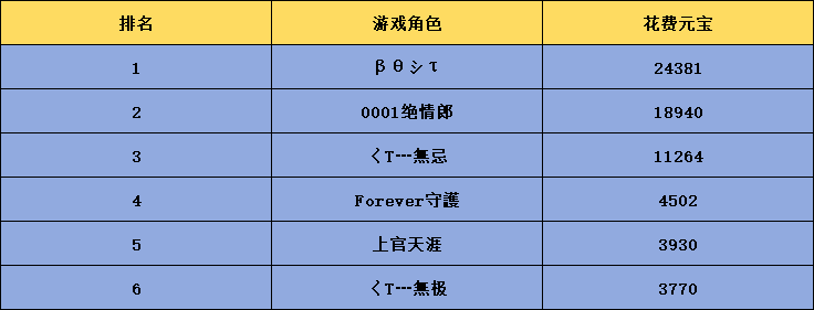 4.消费排行榜中只统计账号内单个游戏账号的消费情况,若使用多个游戏账号进行消费则消费的元宝数量无法进行叠加