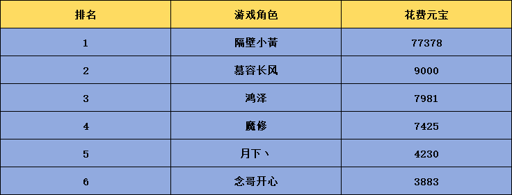 4.消费排行榜中只统计账号内单个游戏账号的消费情况,若使用多个游戏账号进行消费则消费的元宝数量无法进行叠加