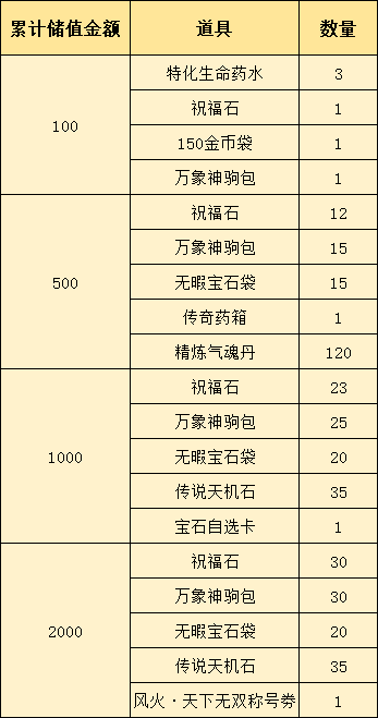 1. 在活动指定时间内储值达活动指定金额即可获赠对应虚拟宝物。