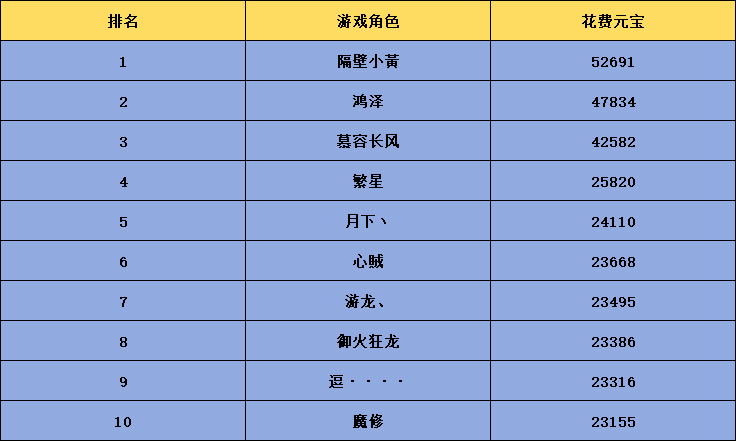 4.消费排行榜中只统计账号内单个游戏账号的消费情况,若使用多个游戏账号进行消费则消费的元宝数量无法进行叠加