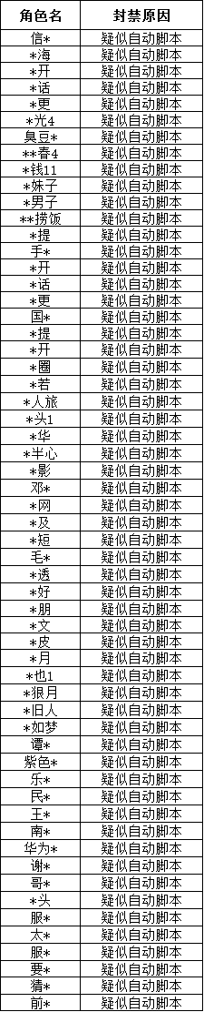 本次封禁名单内主要以自动脚本为主,希望各位英雄能够秉持绿色游戏的态度共同维护游戏环境,同时我们也将加大外挂打架作弊脚本程序的检测和验证,希望各位英雄能够爱惜自己的账号。感谢各位的支持与配合!
