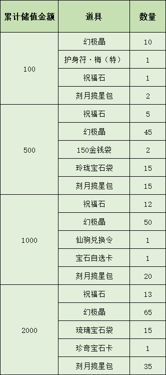 1. 在活动指定时间内储值达活动指定金额即可获赠对应虚拟宝物。
