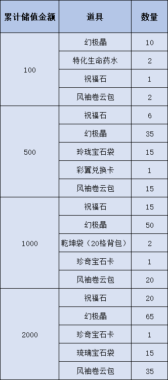 1. 在活动指定时间内储值达活动指定金额即可获赠对应虚拟宝物。