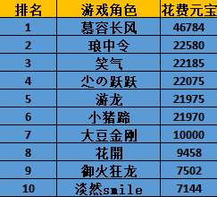 4.消费排行榜中只统计账号内单个游戏账号的消费情况,若使用多个游戏账号进行消费则消费的元宝数量无法进行叠加