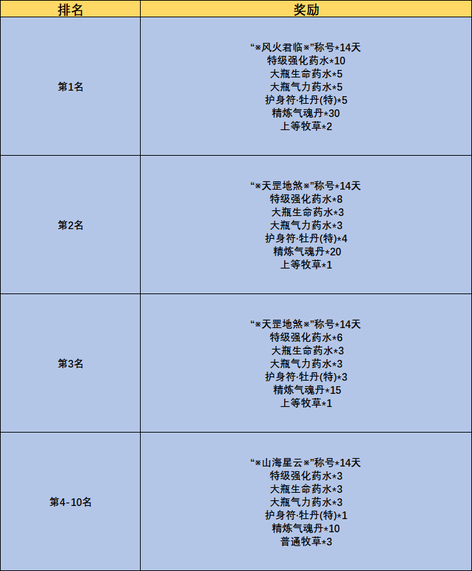 3.排行结果将在活动结束后第一周内在官网公示,排行奖励也将活动结束后第一周内以邮件形式直接发放到排行榜中对应的角色账号中,请确保消费的账号为自己当前使用的账号,避免影响奖励的发放。