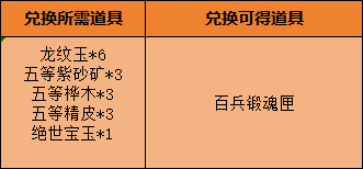 【百兵锻魂匣】:开启后可获得破晓之光、碎星锤、无影、龙脊重锋、雷神支柱、千山月、苍鹰目、裂石铳、织法者长杖、谒渊、不破盟约中任意一件装备(均为装备绑定,装备箱内所有武器的开出几率相同即为随机)