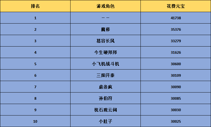 4.消费排行榜中只统计账号内单个游戏账号的消费情况,若使用多个游戏账号进行消费则消费的元宝数量无法进行叠加