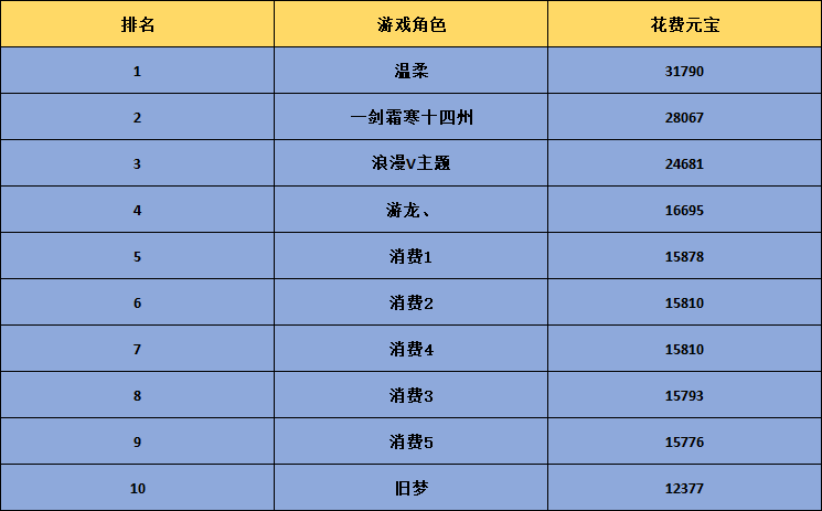 4.消费排行榜中只统计账号内单个游戏账号的消费情况,若使用多个游戏账号进行消费则消费的元宝数量无法进行叠加