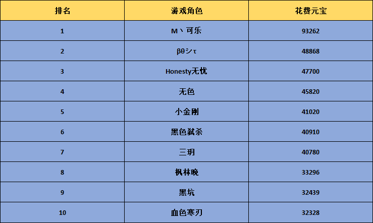 5.当花费元宝相同时将按照花费元宝的先后时间进行排行,优先排行消费时间更早的玩家