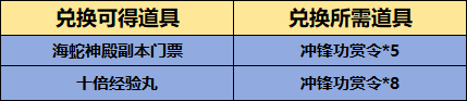 本次维护后,将新增冲锋功赏令兑换海蛇门票,十倍经验丸。(均为绑定)