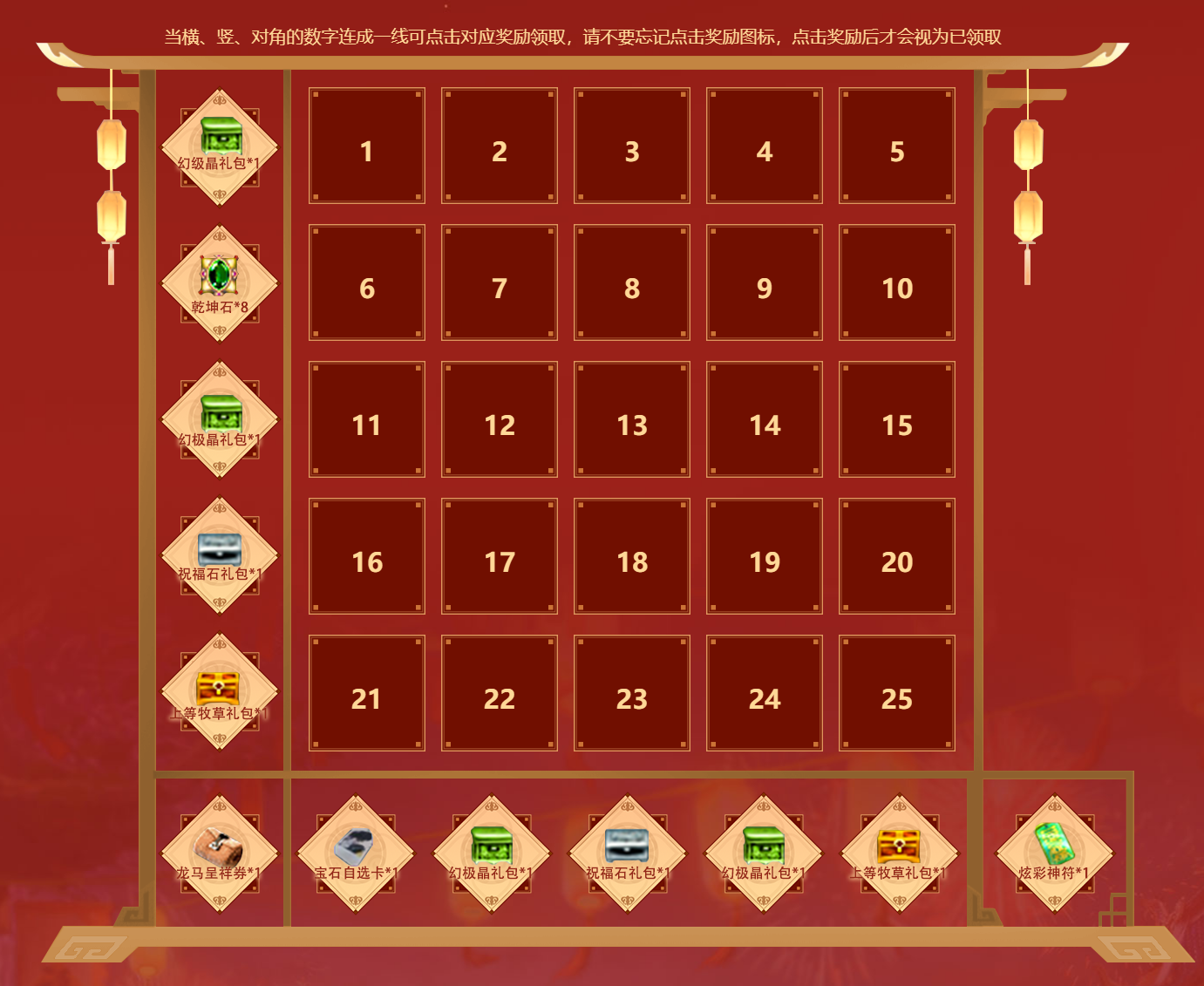 3、每次抽奖将额外获得一个数字,集齐数字可在下方数字格内解锁对应连线奖励。