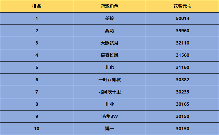 4.消费排行榜中只统计账号内单个游戏角色的消费情况,若使用多个相同游戏账号下不同角色进行消费则消费的元宝数量无法进行叠加