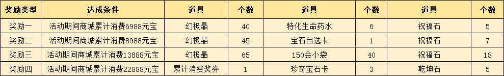 活动内容:活动期间,通过商城花费指定数量的元宝,活动结束后可获得对应的超值奖励。