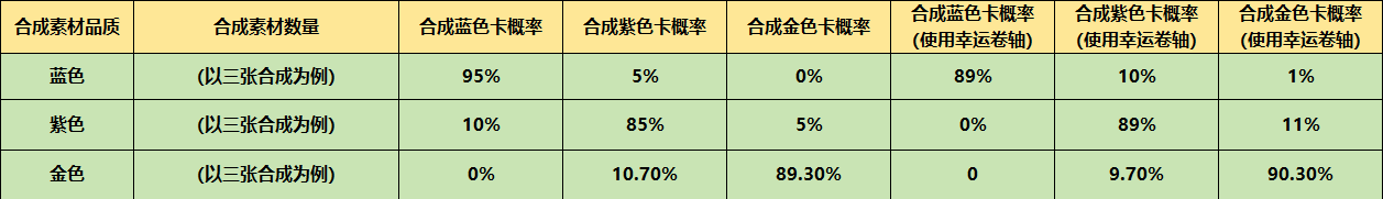 (当玩家使用三张以上卡牌合成时,会随着卡牌数量的增加略微增加合成高品质卡的概率,合成素材数量卡牌最多为10张)