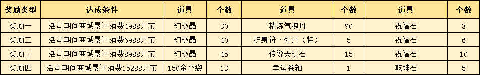 活动内容:活动期间,通过商城花费指定数量的元宝,活动结束后可获得对应的超值奖励。